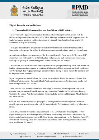 Digital Transformation Delivers Thousands of Sri Lankans Overseas Benefit from e-BMD Initiative Please follow and like us: Previous article Sri Lanka High Commission in Pakistan Celebrates 78th Independence Day in Islamabad Next article Meeting with Business Delegation on Investment and Trade Collaboration