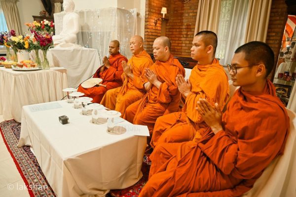 Most Venerable Kurunagala Ananda Gosha Thero from ‘Mahamevna’ Buddhist Monastery in the Netherlands and Chief Incumbent of the Thai Dhammarama Temple in Belgium Venerable Wisuddhi Chotipratoom Thero conducted the Vesak religious programme including the Buddha Vandana, Dhamma Deshana, a brief meditation programme and invoking blessings by chanting Sethpirith followed by ‘Gilanpasa’ Dhana. The Venerable monks highlighted the importance and relevance of practicing the universal teachings of Buddha on compassion, loving kindness, peace, non-discrimination and devotion for humanity, more than ever before as the world sees more human suffering, pain and division.