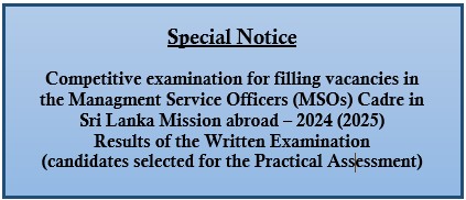 Competitive examination for filling vacancies in the Managment Service Officers (MSOs) Cadre in Sri Lanka Mission abroad – 2024 (2025) Results of the Written Examination -(candidates selected for the Practical Assessment)