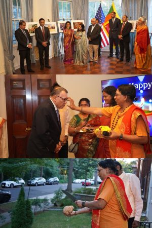 The event included traditional Hindu rituals led by Kurukkal Sivacharyar, who offered blessings to the Ambassador, Embassy staff, and all Sri Lankans, invoking wishes for peace and prosperity. The Embassy grounds were beautifully decorated with intricate ‘Kolam’ patterns and illuminated with oil lamps, creating a joyful and vibrant ambiance.