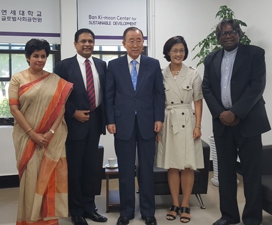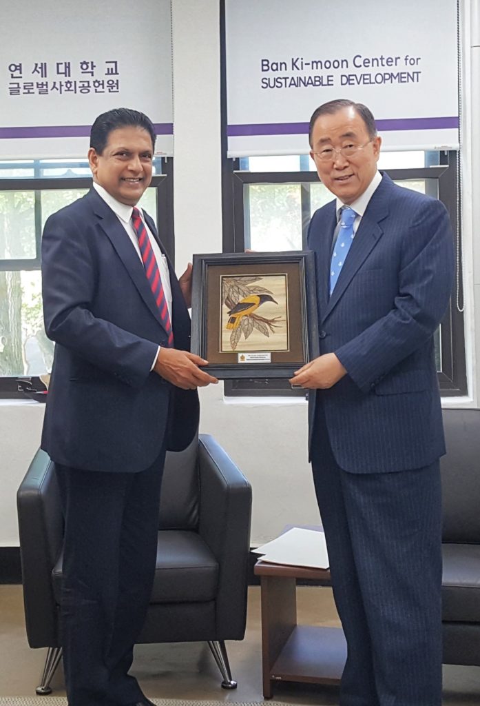 Secretary, Ministry of Mahaweli Development and Environment of Sri Lanka Anura Dissanayake called on Dr. Ban Ki-moon, President of the Assembly and Chair of the Council of the Global Green Growth Institute (GGGI)at the Ban Ki-moon Center for Sustainable Development, Yonsei University in Seoul on Tuesday 17July 2018. The meeting entailed discussion on Sri Lanka’s commitment to sustainable development and cooperation with the GGGI to mobilise climate finance for climate resilient projects. During discussions, Secretary Dissanayake handed over a personal communication from President Maithripala Sirisena to Dr. Ban Ki-moon who conveyed his compliments to President Sirisena through Secretary Dissanayake and looked forward to closer cooperation between Sri Lanka and the GGGI in the future. He also commended President Sirisena’s Blue Green Development Strategy for Sri Lanka which encourages low emission sustainable development.