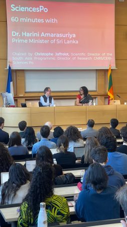 On the invitation of the prestigious French University ScinecesPo, Prime Minister Amarasuriya also participated in an interactive session with students titled “60 Minutes with Dr. Harini Amarasuriya, Prime Minister of Sri Lanka”, which was moderated by Professor Christophe Jaffrelot, Research Director CNRS and Director CERI. The event was organised by the Paris School of International Affairs and the South Asia Programme at CERI, SciencesPo, and was attended by over 250 students who engaged in a vibrant Q&A with the Prime Minister on political developments in Sri Lanka, democracy and geopolitics of South Asia, Sri Lanka’s foreign policy imperatives, as well as multilateral issues of relevance such as climate change and migration, among other topics.